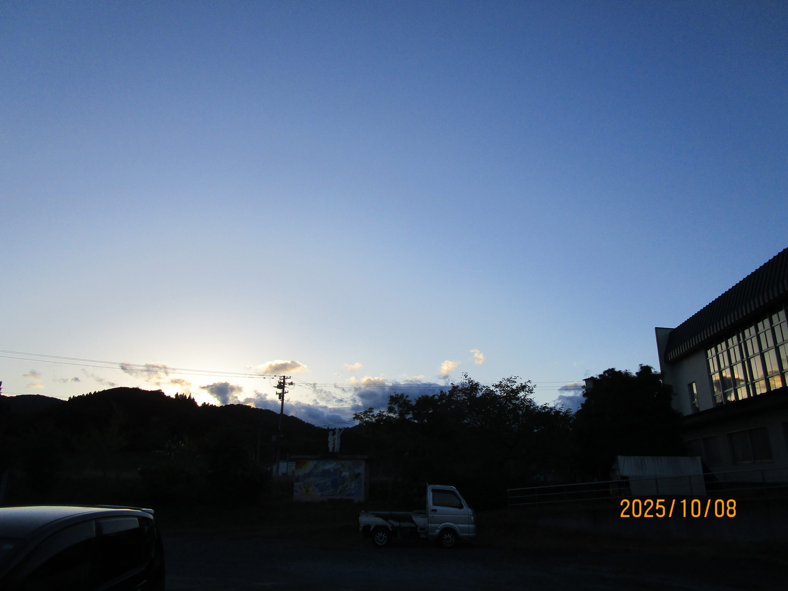 2025年10月8日 / 最終更新日時 : 2025年10月8日 カワハラナオヤ その他 【10月8日】衣川星空観望会 空模様をお知らせします 今夜の観望会を予定している方へ、17:00現在の空模様をお知らせします 【東の空】 【西の空】 【南の空】 日中も秋晴れでしたが、午後5時現在も空全体としては雲は少なめです。 星空の広場は屋外となります。日中は日差しが強く汗ばむ陽気ですが夜は冷え込みますので、上着着用でお越しください。 スタッフも直前まで空模様を見ながら対応を検討します。 当日やむを得ず中止とする場合もありますので、ご理解のほどよろしくお願いします。 Facebooktwitter